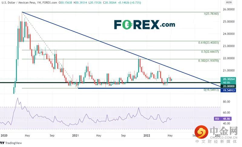 美元/墨西哥比索周图自触及2020年4月疫情高点之后一直交投于一个下降三角形内,多次试图自19.55/20.00区域反弹,但最高也只到过2020年4月高点到2021年1月低点行情的38.2%回档位,即22.15附近。价格目前交投于三角形底部20.32附近。