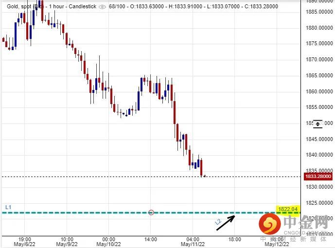 可以部署在$1,822美元左右建立好仓盘,短线看高金价一线至$1,858美元水平后止赚,止损在$1,813美元。