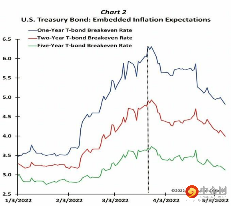 在俄乌冲突爆发引起恐慌之后,市场已经趋于平静。1年期盈亏平衡通胀率已降至5%以下,2年期盈亏平衡通胀率已略低于4%。Leuthold Group指出,“这些下降是整体通胀达到顶峰的最有力证据”。