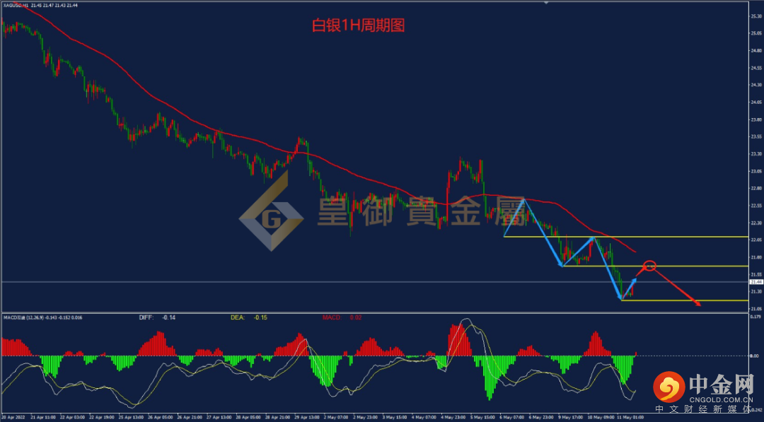 从下图的白银1H周期图来看,前期行情一直围绕着60均线一路单边下行,反弹力度弱,反复试探60均线的压力,屡次受压回落。目前银价仍处于60均线下方运行,且MACD也处于0轴下方运行,空头趋势还在延续,日内关注上方压力21.67、22.09,下方支撑21.17、20.80,操作上建议反弹做空为主。