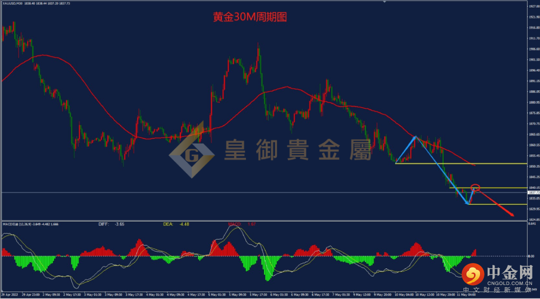 从下图的黄金30M周期走势图来看,近两日行情一直沿着60均线单边向下运行,昨日最高反弹至60均线1865附近,金价受阻回落,破位前期重要支撑位1851一线后,行情便加速下挫,最低下探至1832一线,目前迎来超跌后的弱反弹,但金价仍在60均线下方运行,MACD也处于0轴下方运行,整体走势偏弱。日内关注上方压力1840、1850,下方支撑1832、1821,操作上建议反弹做空为主。