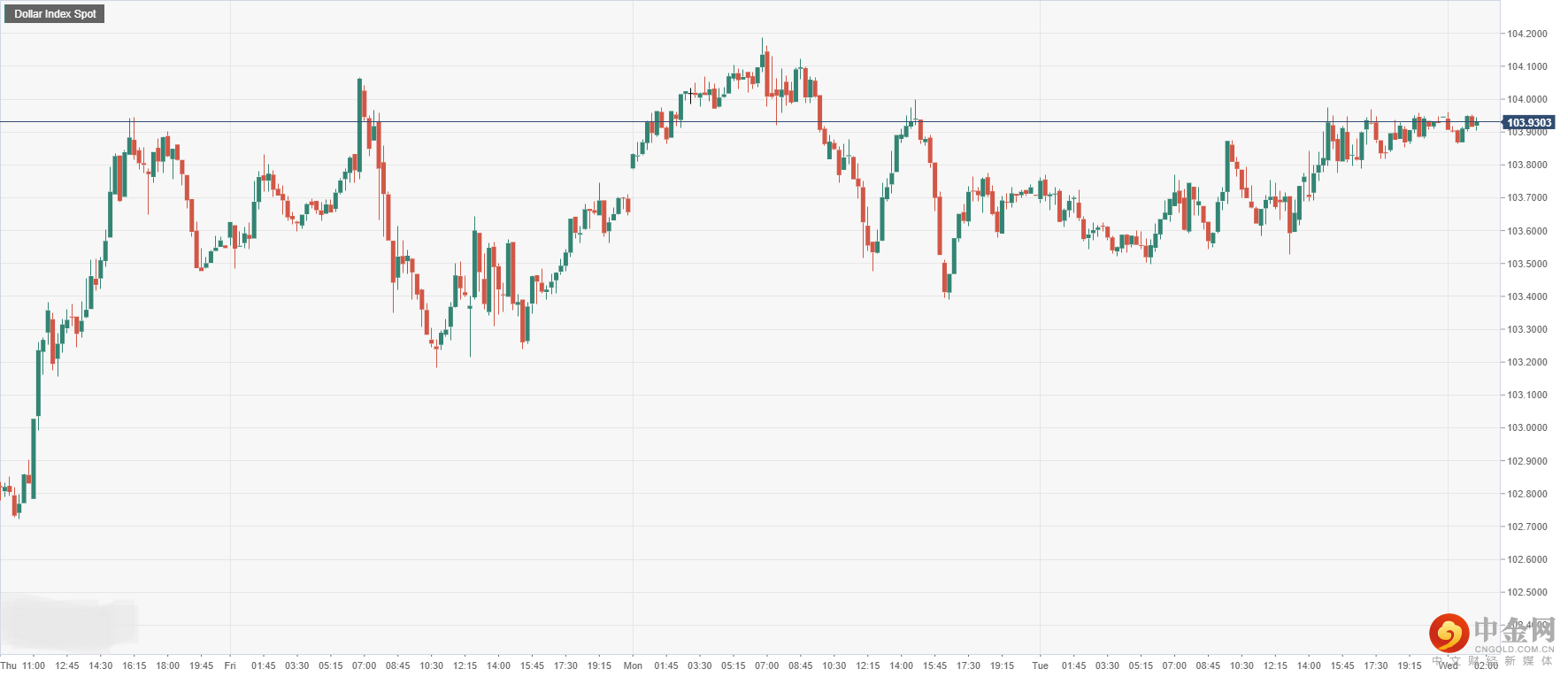 美元指数周二收盘小幅上涨后,今日开盘升0.2%至103.93附近,因总体欧亚大国经济增长受限,使得美元上行提振。