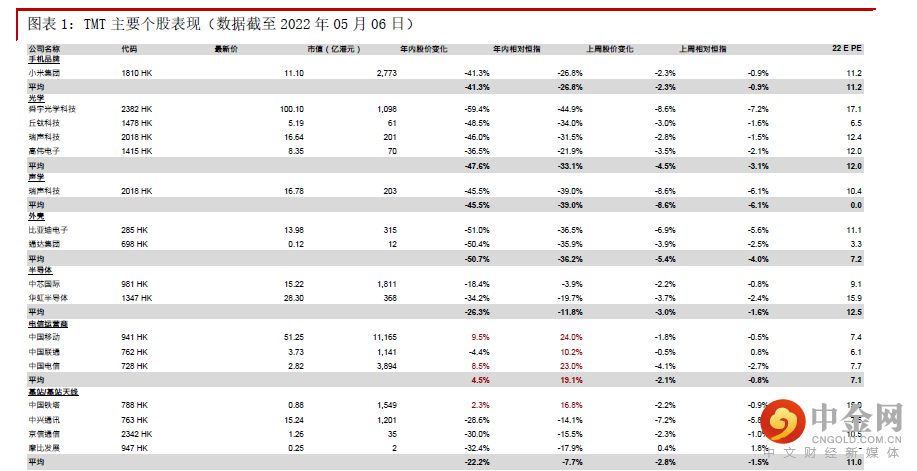 ►舜宇光学科技(2382 HK)公布4月主要产品出货量数据:公司于昨日公布22年4月主要产品出货量数据。其中,手机摄像模组出货量同比下跌19.3%,环比增加6.8%;手机镜头出货量同比及环比分别增加3.5%及6.6%;车载镜头出货量同比及环比分别增加3.4%及8.3%。4月主要产品出货量环比均有改善,但手机相关产品仍受智能手机市场需求较淡影响。前4个月主要产品出货量表现远低于管理层全年指引。考虑到疫情、宏观经济等因素,我们预期短期内智能手机市场需求仍将较弱,对公司相关产品短期出货量及产品结构均有影响,短期不易太过乐观,观望下半年是否会有改善。