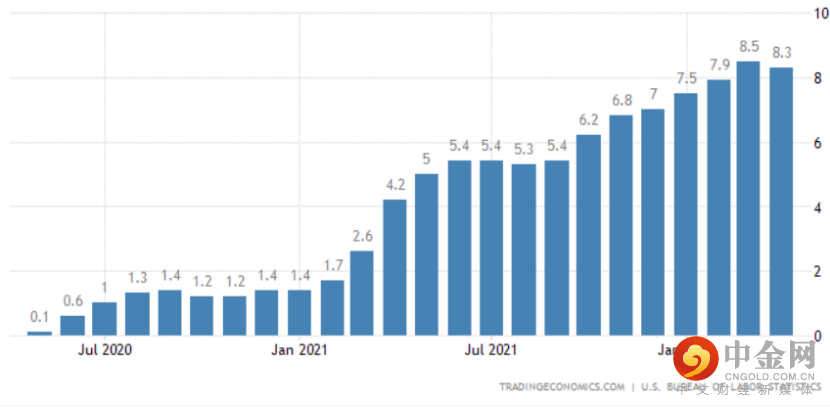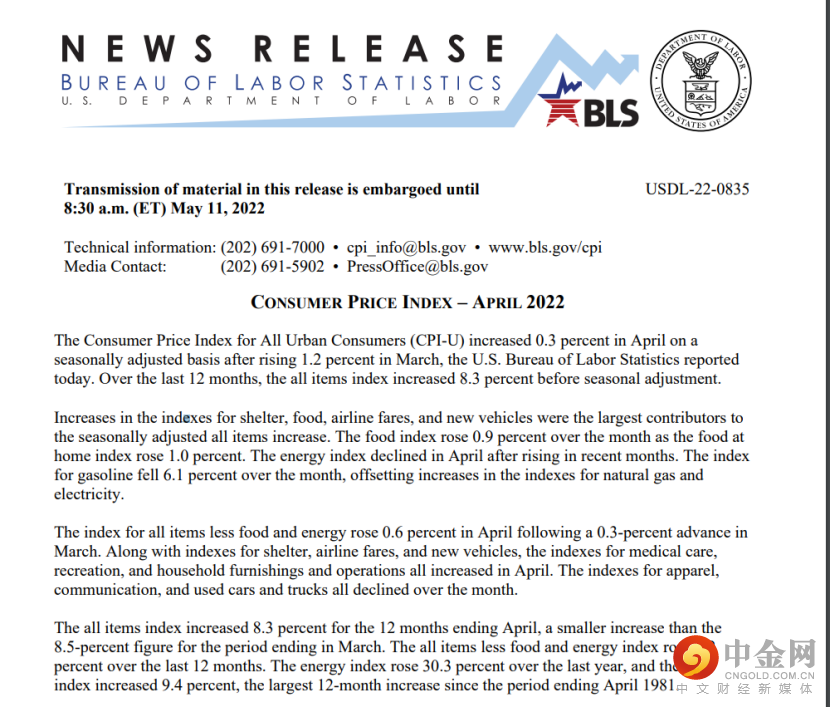 美国劳工部数据显示,美国4月消费者物价指数年率增长8.3%,较上月8.5%的增幅有所回落,但高于市场预期的8.1%。核心CPI同比增长6.2%,较上月6.5%的涨幅有所回落,但高于预期的6%。