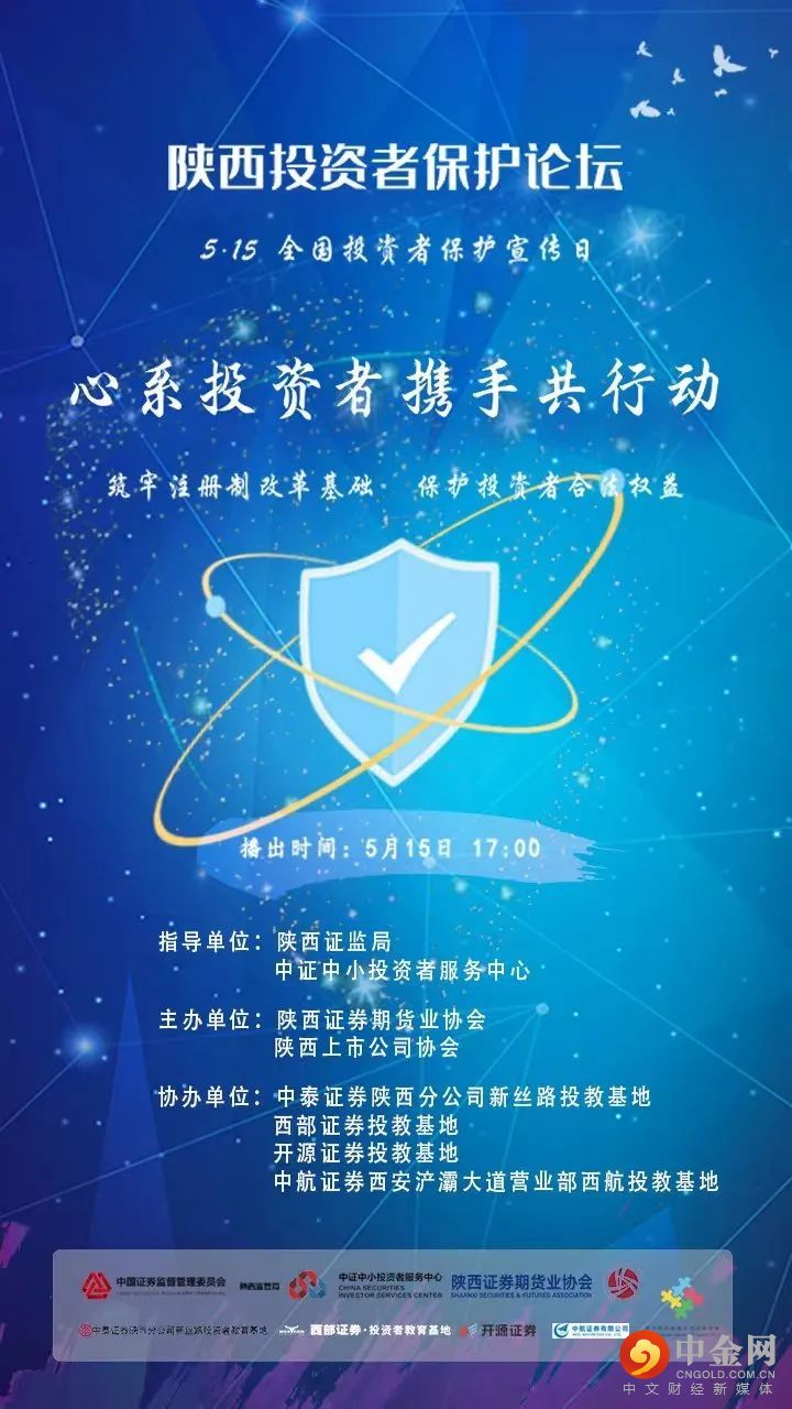 “陕西投资者保护论坛”由陕西证监局、中证中小投资者服务中心共同指导,投教联盟成员陕西证券期货业协会、陕西上市公司协会联合主办,西部证券投教基地、开源证券投教基地、中泰证券陕西分公司新丝路投教基地和中航证券西安浐灞大道营业部西航投教基地协办,将于5月15日17:00在陕西广播电视台生活频道、全景网、闪视频同步播出。