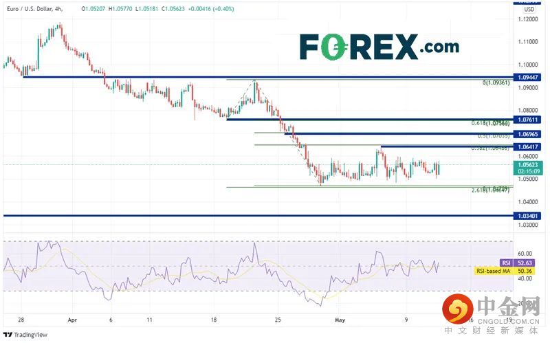 欧元/美元4小时图上的跌势止步于4月19日低点到4月21日高点行情的261.8%扩展位,即1.0465附近。如果后市向下并攻克261.8%扩展位,可能下看2017年1月以来水平支撑位1.0340以及1.0000整数心理支撑位。但如果价格反弹,则可能上看与分别落在1.0648、1.0703 和1.0758的38.2、50%和61.8%回档位完美契合的水平阻力位。