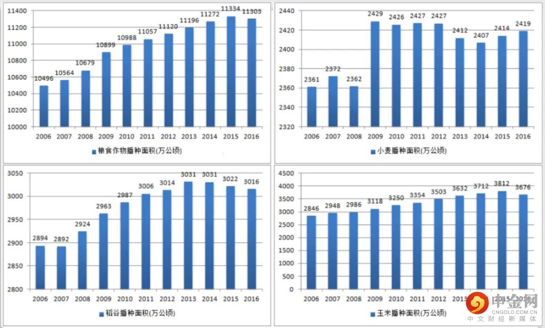 图:2006年-2016年中国粮食作物及三大主粮的播种面积,来源:大国粮商