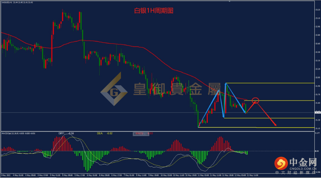 从下图的白银1H周期图来看,前期行情围绕着60均线单边下跌,最低下探至21.17一线,昨日迎来超跌反弹,反弹至60均线附近受阻回落,多头屡次尝试上攻,但多头动能不足,最终仍收在60均线下方,且MACD也0轴下方再次形成死叉,空头趋势还在延续。日内关注上方压力21.64、21.95,下方支撑21.33、21.17,操作上建议反弹做空为主。