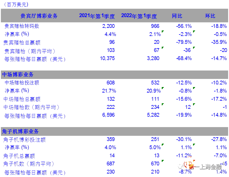 贵宾厅博彩投注额为8.8亿美元, 同比下跌50.8%, 环比增长3.4%。贵宾厅净赢率为3.8%。贵宾厅收益为0.3亿美元,环比增加39.2%。中场赌枱投注额为4.7亿美元, 同比下跌20.6%, 环比减少11.0%。中场净赢率为17.5%。中场赌枱收益同比减少21.8%, 环比减少10.1%, 至0.82亿美元。 角子机的投注额为2.8亿美元, 同比减少5.9%, 环比提升11.2%。每部角子机每日赢额同比增长1.0%, 环比上升60.8%至201美元。于第1季度, 永利澳门平均提供35张贵宾赌台, 248张中场赌台及585台角子机。