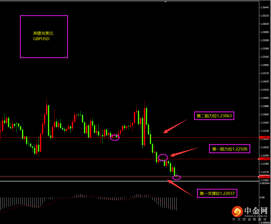 天图英镑收收阴线,价格冲高之后有所回落,空头仍然占优,短期上影线较长,多头仍在,但力度相对较弱,日内更多以偏震荡为主?小时图英镑期间期间连续阴线下滑,MACD转移至0轴之下,空头占优,目前底部无大阳线维稳,且价格跌破震荡低位,空头较强,日内更多以震荡带有一丝下行为主?
