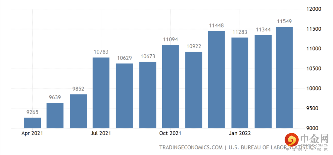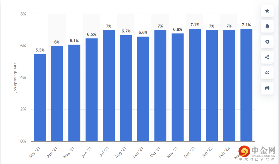 美国方面, 2022年3月,美国就业岗位空缺数量较前一个月增加20.5万个,达到1154.9万个。就业岗位持续短缺。零售业和耐用品制造业的职位空缺分别增加了15.5万个和5万个。运输、仓储和公用事业的职位空缺减少6.9万个。与此同时,创纪录的450万美国人辞职,辞职率上升到3%,职业空缺率高达7.1%。劳动力缺口表明,美国劳动力市场比英国更过热。