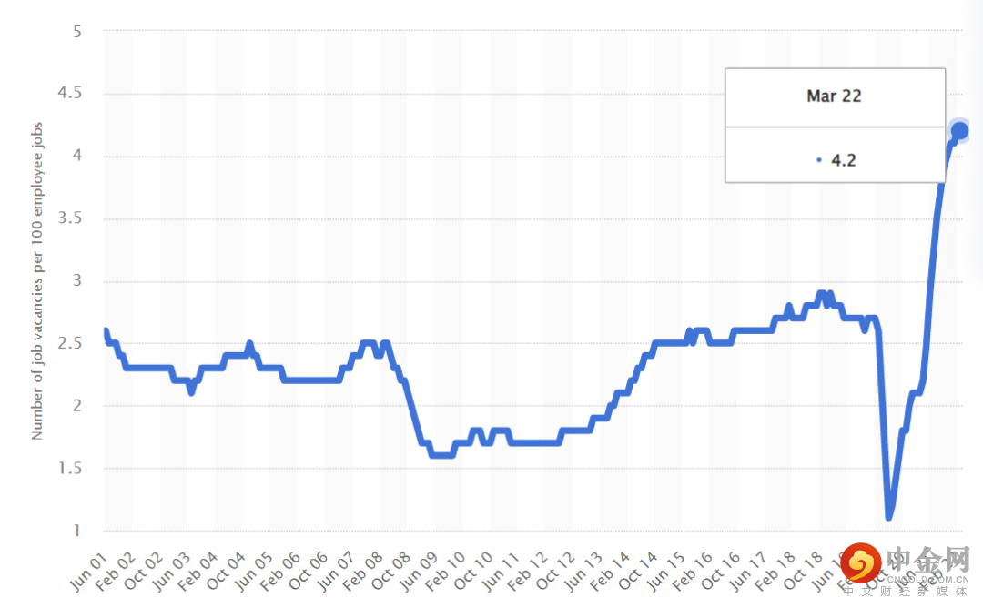但季度增长率继续下降,2022年第一季度降至4.1%,为2020年6月至8月以来的最低水平。一季度职业空缺率略有上升,每100个员工岗位的空缺数量达到4.2。