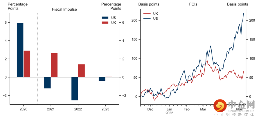 首先,英国的财政政策仍然支持增长,而美国的财政政策急剧转弱。具体来说,预计今年英国财政增长的推动力约为1pp,而美国则拖累超2pp。