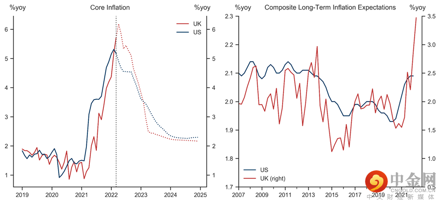 未来潜在的通胀压力远远超过了目标,英国核心CPI同比上涨将在2022年达到峰值约6%。虽然随着供应瓶颈的可能减弱,核心通胀率或有所放缓,但两国明年的通胀率可能都将显著高于2%。此外,两国长期通胀预期指标也有所上升,将高于平均水平。然而,英国的增长看起来更明显,而美国,远期预期利率仍明显稳定在2%左右。