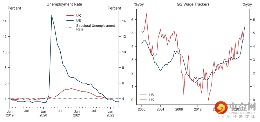 第二,这两个经济体的工资增长都非常强劲。高盛的工资追踪器显示两国涨幅已经攀升到同比5%左右,大大高于新冠疫情之前的速度。展望未来,预计英国和美国的工资增长将保持稳固,超过2%的通胀率。