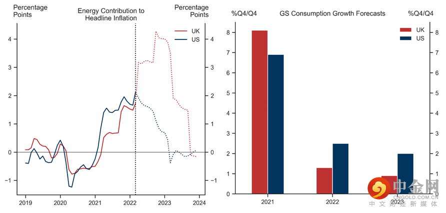 英国央行持谨慎态度的主要原因是英国的生活成本危机。俄乌战争推升了能源和粮食价格的大幅上涨。英国食物消费超40%来源于进口,是美国的两倍。并且,欧洲的天然气价格涨幅也远高于美国。预计到年底,英国的能源冲击预计将比美国大得多,因为美国在最新的通胀数据报告中已经显示,能源贡献的通胀在减少,汽油价格下降明显。根据高盛预计在年底英国能源对通胀的贡献大约是美国的两倍(下图左)。因此,英国的高通胀的持续时间将比美国更长,峰值的出现也会更晚,英国央行预计今年通胀率可能会达到10%,明年可能会下降。两年内下降至约2%。预计能源价格飙升对英国家庭消费增长的影响将比美国更大,明年第四季度将降至1%以下(下图右)。