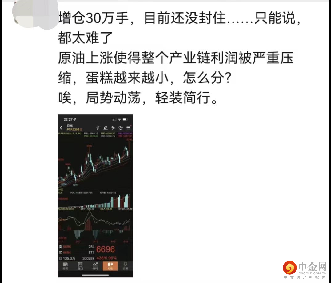 周三夜盘,PTA期货在化工品中一骑绝尘,引来了较多投资者的关注。当晚,PTA期货直线而上,持仓量迅速上行,2209合约最高增仓达30万手,多合约涨停引发各化工分析群的热烈讨论,朋友圈也纷纷晒出久违的涨停图。