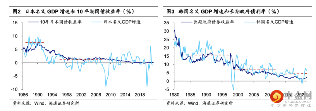 东亚经济体中的日本和韩国,拉长时间来看,两地的长债利率水平也基本接近当地的名义经济增速,尤其是在几轮经济增速换挡期间,当地的利率都出现同步的下移。