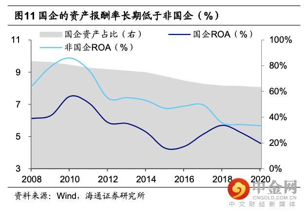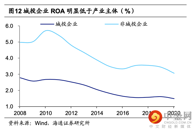 投资回报率偏低通常意味着投资需求面临收缩。但与发达经济体不同,目前我国的企业结构中,国企和城投类的公司占了不小的比重。而很多时候这些企业需要承担逆周期调节的作用,带动大量资金投向基础设施等回报率偏低的项目。具体来看,我国上市公司中国有企业的资产报酬率(ROA)长期低于非国有企业,但国企总资产和利润占比依然在60%以上。截至2020年,我国城投企业的平均ROA甚至已经下滑到不足2%,不仅低于其他产业主体,甚至不及融资平台公司发债成本。