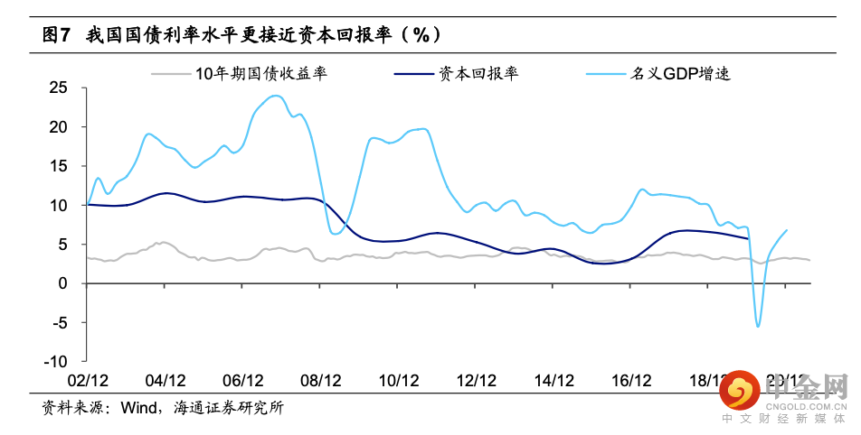 2002-2008年我国资本回报率平均在10.6%水平,远低于当期16.4%的经济增速。2012年以后,我国资本回报率大幅下滑到4.8%的平均水平,与名义经济增速均值依然有4.5个百分点左右的差距。而相比之下,同期的国债利率水平约为3.5%,与资本回报率更为接近。