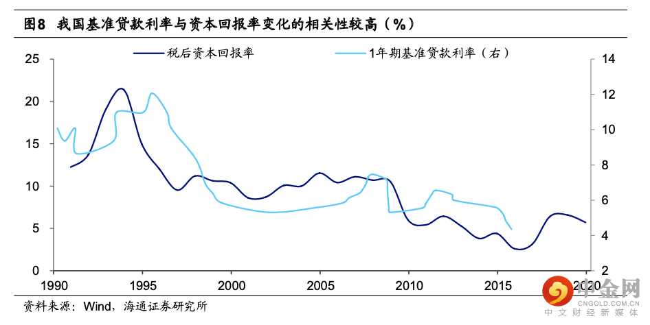 这里需要说明的是,我们测算得到的是整体资本回报率,而对于利率来说,决定利率水平的主要是当期边际资本回报率。随着资本的大量积累,边际资本回报率是会递减的。因此从理论上说,利率水平也应该低于整体的资本回报率。