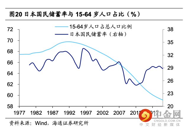 同时,作为投资的来源,我国储蓄率的下滑或也难以避免。理论上,一个国家的储蓄率就决定了其投资率的合意水平。如果要维系储蓄率下降但高投资的状态,就会导致外债规模迅速上升从而增加系统风险。而储蓄率的变化本质上是人口结构的变化,比如随着15-64岁人口占比在1991年前后达到高点并持续回落,日本的国民储蓄率和居民储蓄率也都自1991年开始持续下滑。