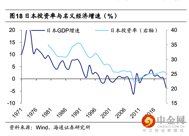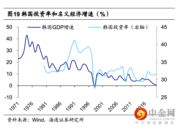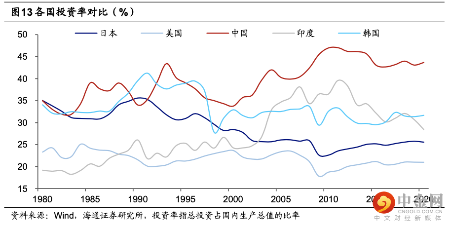 而对于基础设施建设,包括地产投资等,只要资金大量投入,都能够在短期拉动经济增速。这也就是我国资本回报率与名义经济增速分化的主因,也即尽管投资回报率不高,但依然有大量资金用于投资,带动我国投资率长期处在高位,支撑我国经济高增长。2009年以后我国投资率进一步上行至45%,而同期美日韩的投资率都在30%左右甚至更低。