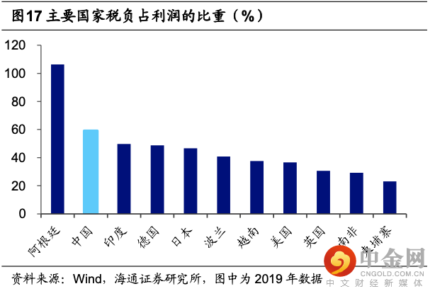 另一方面,我国的资本回报率偏低,也与我国税负水平有关。决定资金利率水平的主要是税后资本回报率,我国的税收水平在全球主要国家中处于偏高水平,压低了资本收入份额。2019年,我国总税率在利润中的占比达到59%,如果不剔除税收,我国的资本回报率要比税后回报率高出至少5个百分点。