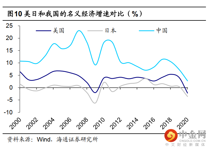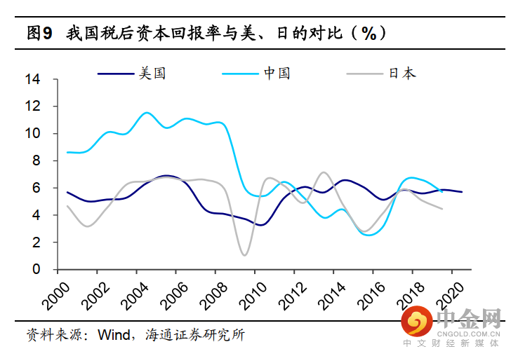 对比其他国家,在2008年中枢整体下移后,我国的税后资本回报率就与美国和日本处在相对接近的水平,而经济增速却明显高于美日水平。2010-2019年的十年间,我国平均税后资本回报率为5.0%,美国和日本分别在5.5%和5.2%;而我国的名义经济增速平均在11%,远远高出美国和日本(分别为4.0%和1.2%)。