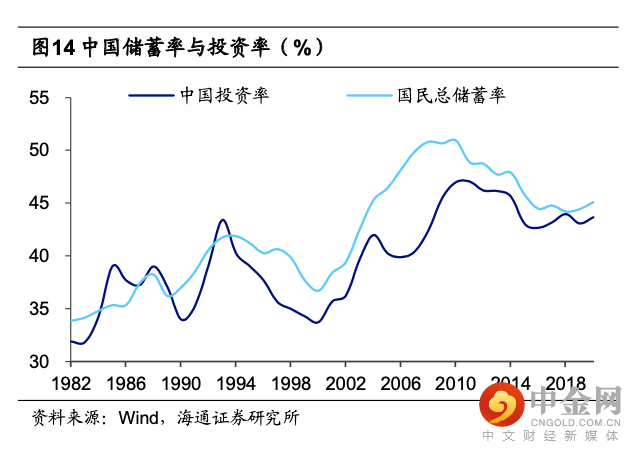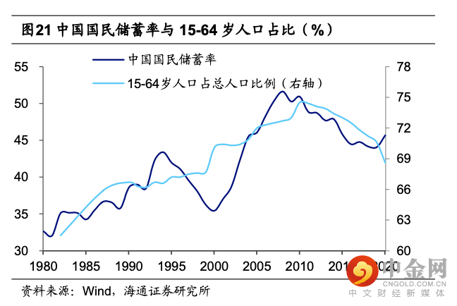 而我国储蓄率的变化也与人口结构密切相关。2010年以前,我国15-64岁人口占总人口的比重保持稳步上升趋势,同期我国的国民储蓄率也从1980年的32.6%攀升到2010年的50.9%。而近年来劳动年龄人口占比的缓步下滑,直接导致了我国储蓄率的回落。往前看,我国人口老龄化的加剧或将继续带动储蓄率下行,无法支撑投资增速再像以前一样维持在较高水平。