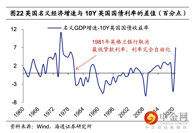 不过,随着利率市场化的推进,我国利率也存在一定的向经济增速收敛的动力。我国利率仍未完全市场化,会对利率水平形成一定压制,包括抑制利率随着经济而波动。因而随着我国利率市场化改革的推进,利率与名义GDP增速之间的差距或也将缩小。参考英国的经验,在1981年英国利率实现完全自由化以前,利率水平长期贴近经济增速的下限,而此后,英债利率更多时候围绕经济增速波动,甚至连续高于名义经济增速。美国的情况也很类似。