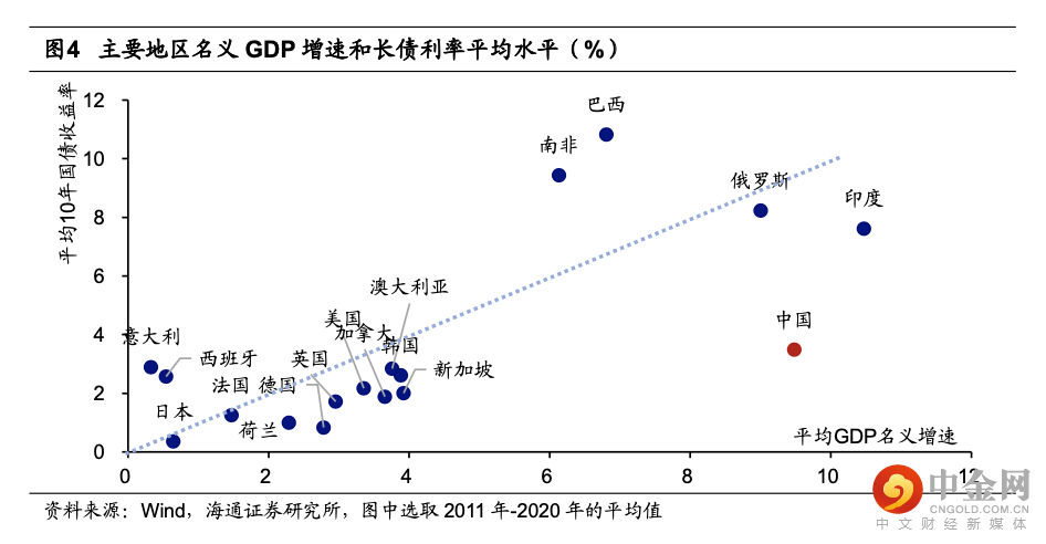 根据“利率黄金法则”,在最大化消费的条件下,理论上经通胀调整后的真实利率r应该与实际经济增长率g相等,换言之,一国的长期名义利率与名义GDP增速水平应大致相当。