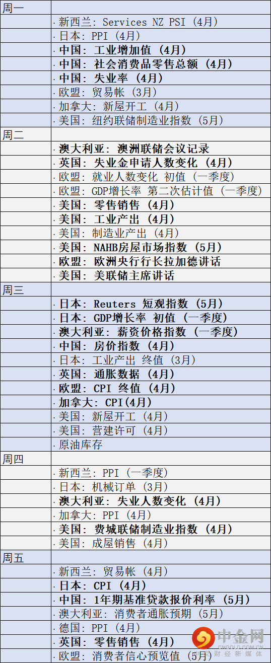 本周除了美国和英国,中国也将揭晓4月零售销售报告。上海市乃至全国的整体疫情管控措施对4月支出的影响程度有多深?对于4月社会消费品零售总额的预期值为下降6.1%(前值下降3.5%)。中国还将公布4月工业增加值和失业率。工业增加值年率料降至0.4%(前值5%)失业率料自5.8%上升至6%。交易者需要观察这些定于周一公布的数据,中国经济增长如果放慢,可能导致供应链持续不畅,并有可能拖累其它国家的经济同样放慢。