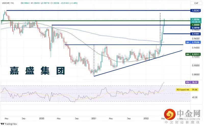 美元/瑞郎上周暴涨并击穿平价,收上1.000。该货币对连续第6周收高,并创下2019年5月27日当周以来最高点。自2019年春季到达1.0226以来,美元/瑞郎不断下跌,在2021年第一周触及0.8768,然后开始上涨并形成上升三角形形态。在4月18日当周,美元/瑞郎于0.9460附近暴烈上破三角形,此后一骑绝尘。该货币对过去6周自0.9237低点涨至本周高点1.0049,涨幅近8.8%。上升三角形突破后的目标为突破位加上三角形的高度,本例中在1.0160附近。上方无重大阻力,直到2019年5月6日高点1.0226。但请注意,RSI处于超买区域,暗示价格或准备回撤。周图第一支撑位在2020年3月以来双顶所在的0.9900,然后是上周低点0.9871,接着是2周前以来的低点0.9709。