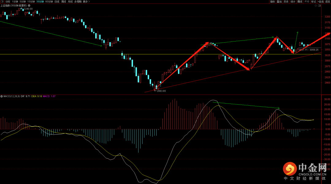 大盘险守三十分钟的上升趋势线,短期有继续向上的动能,关注3126点附近压制,注意后续是否继续出现三十分钟顶背驰结构,一旦出现则大概率会出现再次的回落去回补下方跳空缺口。而上方绝对压制可能出现在3165到3180区间,这个区间将很难逾越过去,注意把控好节奏点,关注日线macd量柱的收缩情况。
