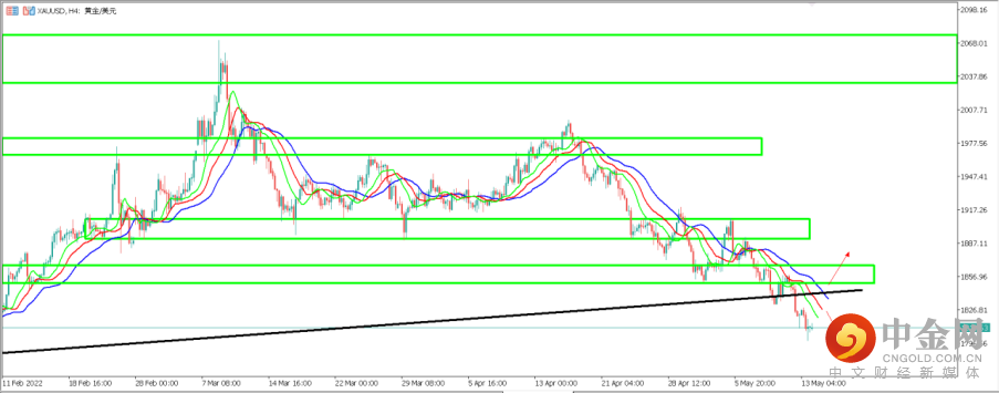 3. 黄金兑美元(XAUUSD):黄金这边上周总体走势疲软,大约周跌幅在4.3%附近,周五盘中最低价触及1798美元一线创近3个半月来新低。从天图周期来看,目前黄金下跌速度在上周加速,价格运行于下跌趋势中,鳄鱼指标也是呈现明显的空头排列。天图重要支撑区间1850一线上周被确认跌破,价格脱离该区间后继续快速下跌。目前价格在1810美元附近徘徊,如果价格能够企稳反弹,有望回测上方1830一线。反之如价格继续下跌,则天图下一支撑区间位于1750一线附近。4小时周期来看,下跌趋势则更加明显,价格沿着鳄鱼指标一路下跌。鳄鱼指标可作为短期移动多空分界参考,如价格站上鳄鱼指标则有望止跌反弹,反之价格大概率将顺势继续下跌。目前价格正位于1811一线附近运行。