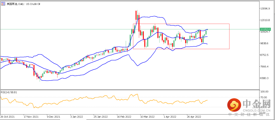 4.美国原油(US Oil):美油上周三连阳,受到俄乌暂停谈判及中立欧盟国芬兰瑞典或纷纷加入北约的消息,推升了地缘政治进一步恶化情绪,支撑美油站稳110.00之上。技术面日图来看,美油总体走势还是在92.50-117.00波动区间内,短期略偏多。