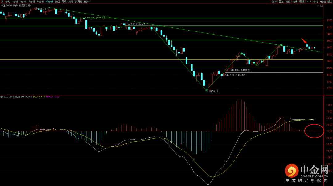 中证500弱势突破六十分钟的下降趋势线,短期关注5680附近的支撑一旦跌破就有概率回落到5500附近由于小级别结构呈现混乱状态,反弹大概率无法非常顺畅,注意高抛节奏点。
