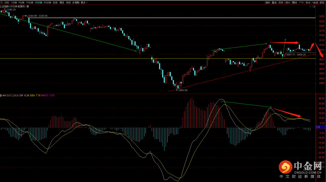 大盘高开后出现五分钟与十五分钟顶背驰后出现再次回落,短期离下方缺口仅仅一步之差,关注三十分钟的上升趋势线是否会被跌破,在没有跌破之前还有机会再次上冲一次。届时构筑多重顶背驰结构再次回落,而下方支撑需要关注2975附近。而如果想要新低则需要跌破2940方有这个概率。