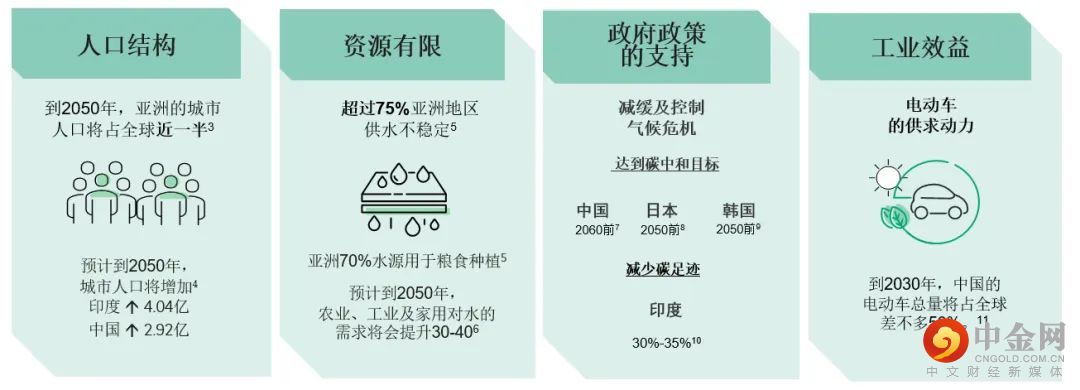 人口结构 : 到2050年,亚洲的城市人口将占全球近一半³,预计到2050年,城市人口将增加⁴,印度将增至4.04亿,而中国 则增至2.92亿。