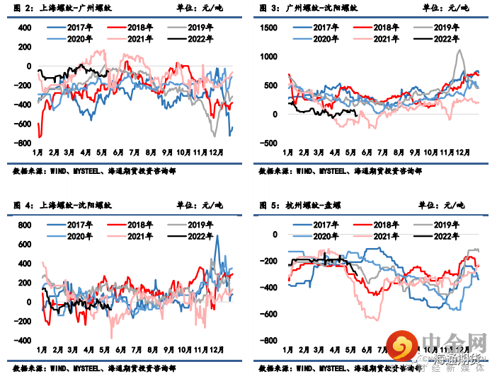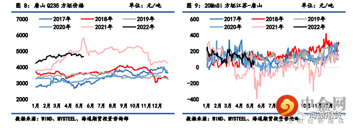 上周钢材期货盘面价格震荡运行,现货价格相对坚挺。上周螺纹钢 2210 合约下跌 3.39%至 4670元/吨,热轧卷板 2210 合约下跌 3.31%至 4767 元/吨。上周上海螺纹下跌 110 元/吨至 4900 元/吨,杭州螺纹下跌 130 元/吨至 4850 元/吨,广州螺纹下跌 150 元/吨至 5110 元/吨附近,北京螺纹下跌110 元/吨至 4920 元/吨。螺纹华东华南过磅价差增至-58 元/吨附近,华南北方过磅价差从 64 收窄至-24 元/吨附近。上海热卷下跌 70 元/吨至 4820 元/吨,广州热卷下跌 120 元/吨至 4870 元/吨,华东卷螺价差从热卷价格低于螺纹 120 元/吨扩大至 80 元/吨。上周各地区钢坯现货价格表现偏弱,唐山方坯 Q235 下跌 50 元/吨至 4660 元/吨,唐山 20MnSi下跌 50 元/吨至 4760 元/吨,江苏 20MnSi 下跌 30 元/吨至 4830 元/吨,江苏和唐山间价差升至 70元/吨。