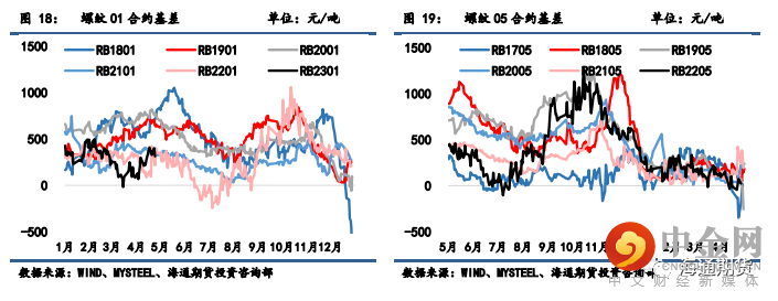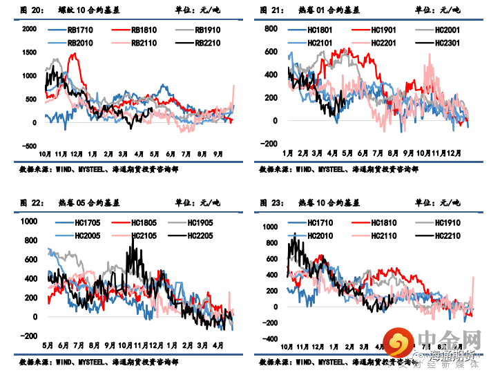 螺纹 01 合约基差从 408 缩小至 314 元/吨,螺纹 05 合约基差从 104 缩小至 22 元/吨,螺纹 10合约基差从 296 缩小至 230 元/吨。热卷 01 合约基差从 260 缩小至 142 元/吨,热卷 05 合约基差从80 缩小至-31 元/吨,热卷 10 合约基差从 150 缩小至 53 元/吨。