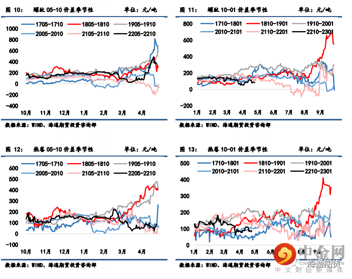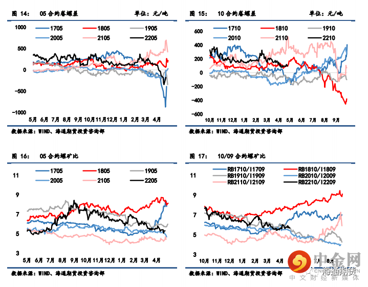 螺纹 05-10 月间价差从 348 小幅扩大至 360 元/吨,10-01 月间价差从 112 缩小至 84 元/吨;热 卷 05-10 月间价差从 70 微增至 84 元/吨,10-01 月间价差从 110 缩小至 89 元/吨。上周螺纹钢与热