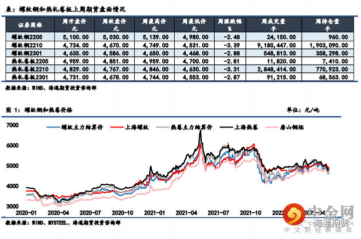 上周钢材期货盘面价格震荡运行,现货价格相对坚挺。上周螺纹钢2210 合约下跌 3.39%至 4670 元/吨,热轧卷板 2210 合约下跌 3.31%至 4767 元/吨。螺纹和热卷 5-10 价差小幅扩大,10-1 月价差小幅缩 小;螺纹和热卷现货弱于期货,基差走弱;期货方面热卷与螺纹表 现相当,卷螺价差大致维稳;铁矿强于成材,螺矿主力比价回落。