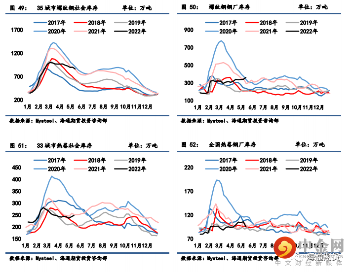 库存:螺纹钢社会库存下降、钢厂库存增加,热卷社会库存微增,钢厂库存大减,总体库存压力仍处高位。据 Mysteel 统计,5 月份多家钢厂停产减产,其中沙钢一座 2500m3高炉检修 31 天,一方面体现产能置换工作有序推进,另一方面钢企短期生产仍会受到多因素牵制。物流和需求环比略有缓慢恢复迹象,但去库存周期表现远不及往年,库存压力成为当前钢价弱势调整的主要症结,短期仍需警惕黑色产业链负反馈风险,但在供需中期受多重牵制以及需求环比修复的预期下,中期趋势性下行条件恐仍不够充分。此外,近期高炉复产、铁水产量回升一定程度上也会强化成本支撑力量,预计短期将以宽幅震荡形势进行需求验证。