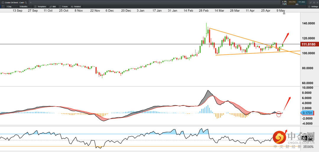 技术面上,日线级别布伦特原油已经形成三角区间的向上破位。MACD指标已有拐头向上之势,RSI指标位于多头区间。因此价格或继续向上攀升。上方目标:125。
