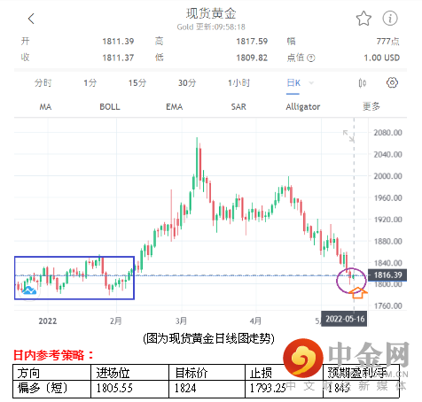 由于美元强势打压黄金,再加上上周五美股强势反弹,以及美10年期国债收益率上周五转涨,成为黄金上行阻力。不过,观察上周五黄金走势,盘中虽一度跌破1800关口,但旋即反弹,以及收盘跌幅收窄与持稳1800关口上(收:1811.37),显示空方获利出场的迹象。另外,上周五纳指大涨,今日有机会休息整理与微幅上行,成为黄金趁势反弹机会,搭配美联储主席鲍威尔上周四重申6、7月升息50个基点与不能保证经济软著陆,显示美联储无更进一步加速升息的计画,搭配在美联储强势升息下,经济恐受冲击而放缓,以及高油价支撑高通胀,均为黄金反弹利基。