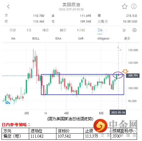 上周五美油整理上行,最高来到110.630美元/桶,最低来到106.310美元/桶,上涨3.59%,收110.465美元/桶。