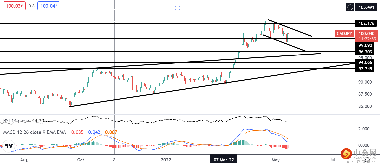 加元日元目前的走低可以被视为一个修正的牛旗形态,暗示最终突破和继续走高的空间。价格目前位于 99.09 水平上方,而在该标记上方,仍有向上突破的空间,102.17 是新多头走向 105.33 的关键水平。