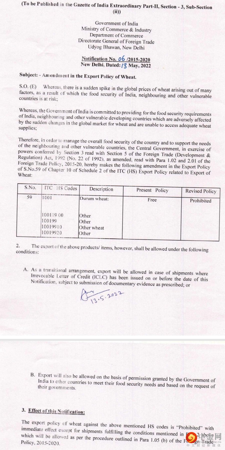印度对外贸易总局文件显示,为保障印度及领国的粮食安全,印度贸易署对与小麦出口有关的出口政策进行了修改。文件规定,禁止印度小麦出口,禁令即刻生效。不过,已签发信用证的出口或印度政府批准的出口可以继续。